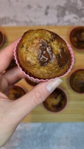 Sposób przygotowania: wszystkie składniki oprócz gorzkiej czekolady dokładnie ze sobą miksujemy. I dopiero po wymieszaniu dodajemy posiekaną gorzką czekoladę i mieszamy masę. Przekładamy do foremek, pieczemy w 180stopniach przez około 20minut.