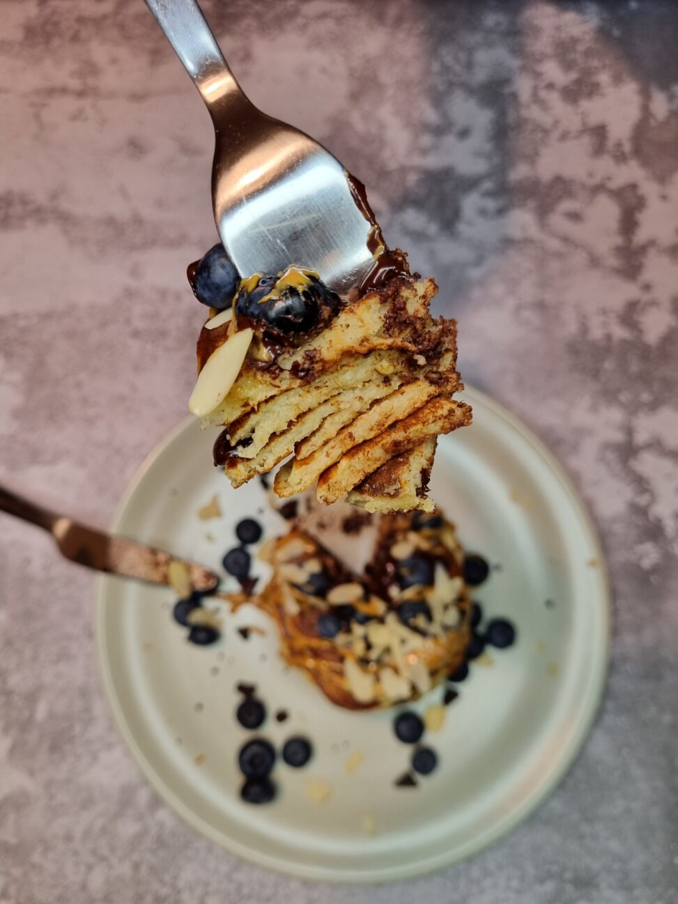 jajo, skyr, mąkę, erytrol, proszek do pieczenia dokładnie razem wymieszaj. Na oliwie smaż pankejki na małym ogniu z obu stron po kilka minut. Po upieczeniu podaj z masłem orzechowym, czekoladą i borówkami.