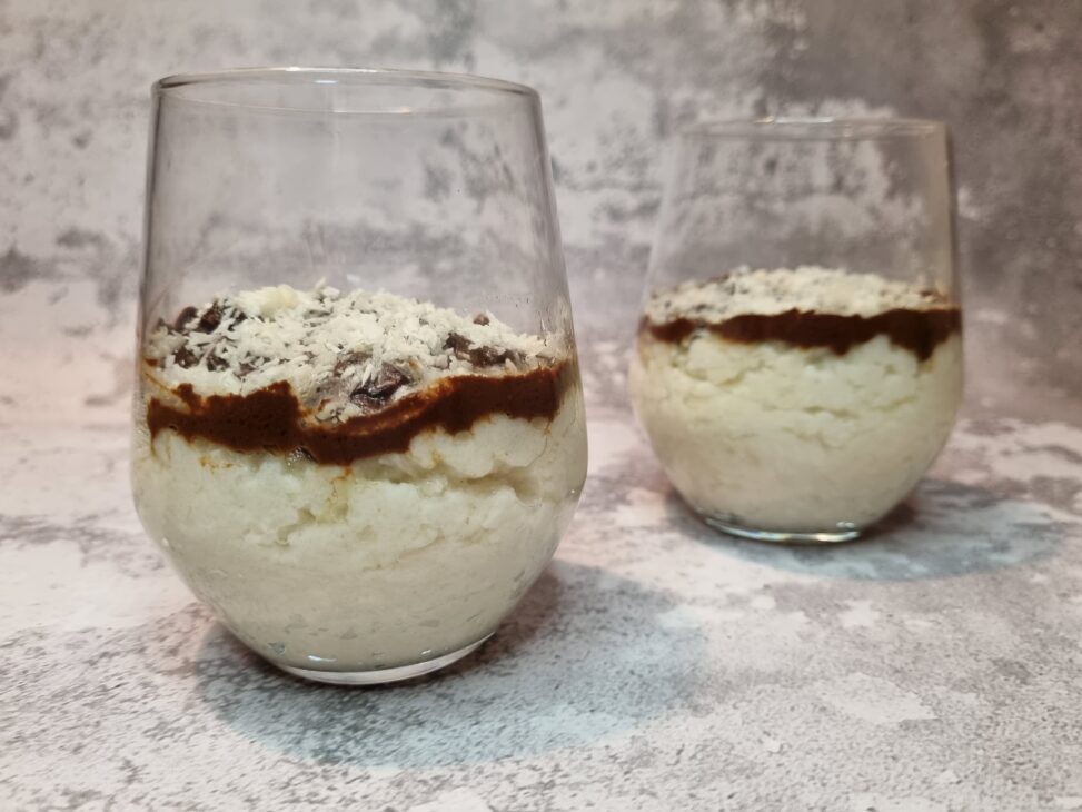 kaszę mannę gotujemy na napoju kokosowym, dodajemy erytrol. Na koniec gotowania dodajemy wiórki kokosowe. Czekoladę rozpuszczamy z mlekiem i polewamy naszą polewą deser.