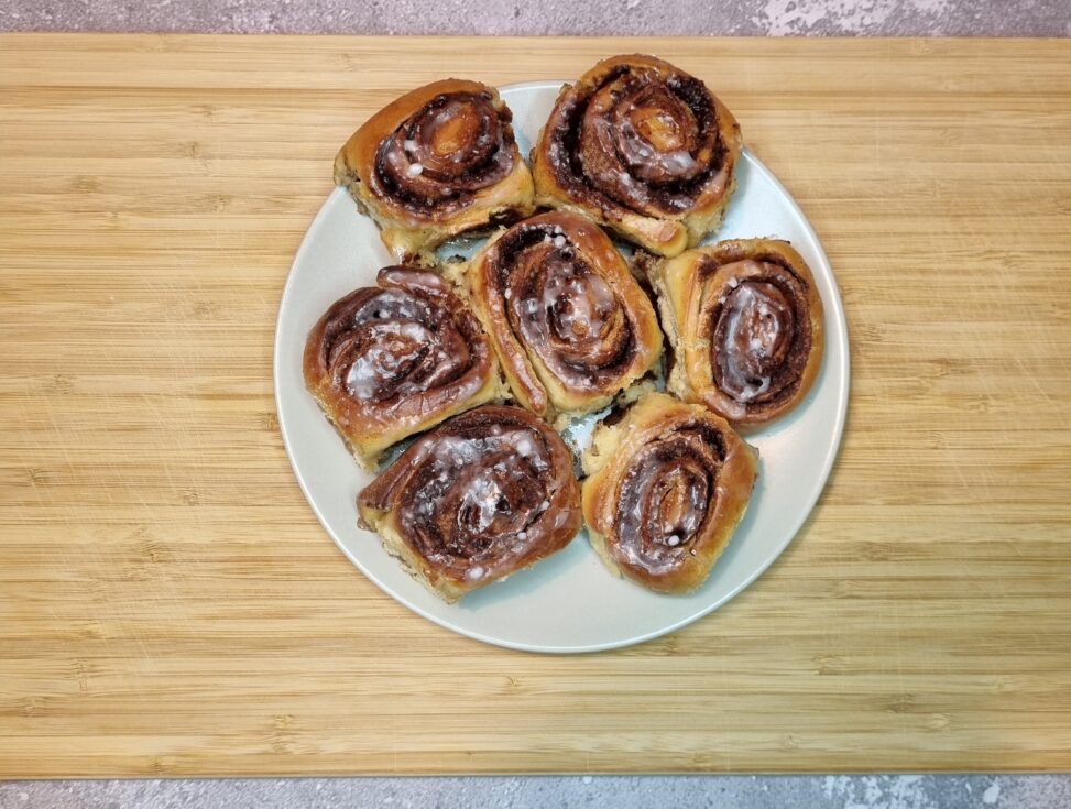 Robimy nadzienie: roztapiamy masło, cukier mieszamy z cynamonem, całość razem łączymy i smarujemy rozwałkowane ciasto. Zawijamy i kroimy na mniejsze kawałki o grubości około 3cm. Odstawiamy do wyrośnięcia na 30min. Opcjonalnie posmaruj je po wierzchu odrobiną mleka lub jajkiem. Pieczemy w 180stopniach przez około 20minut. Składniki na lukier wymieszaj ze sobą, posmaruj przestygnięte bułeczki cynamonowe.