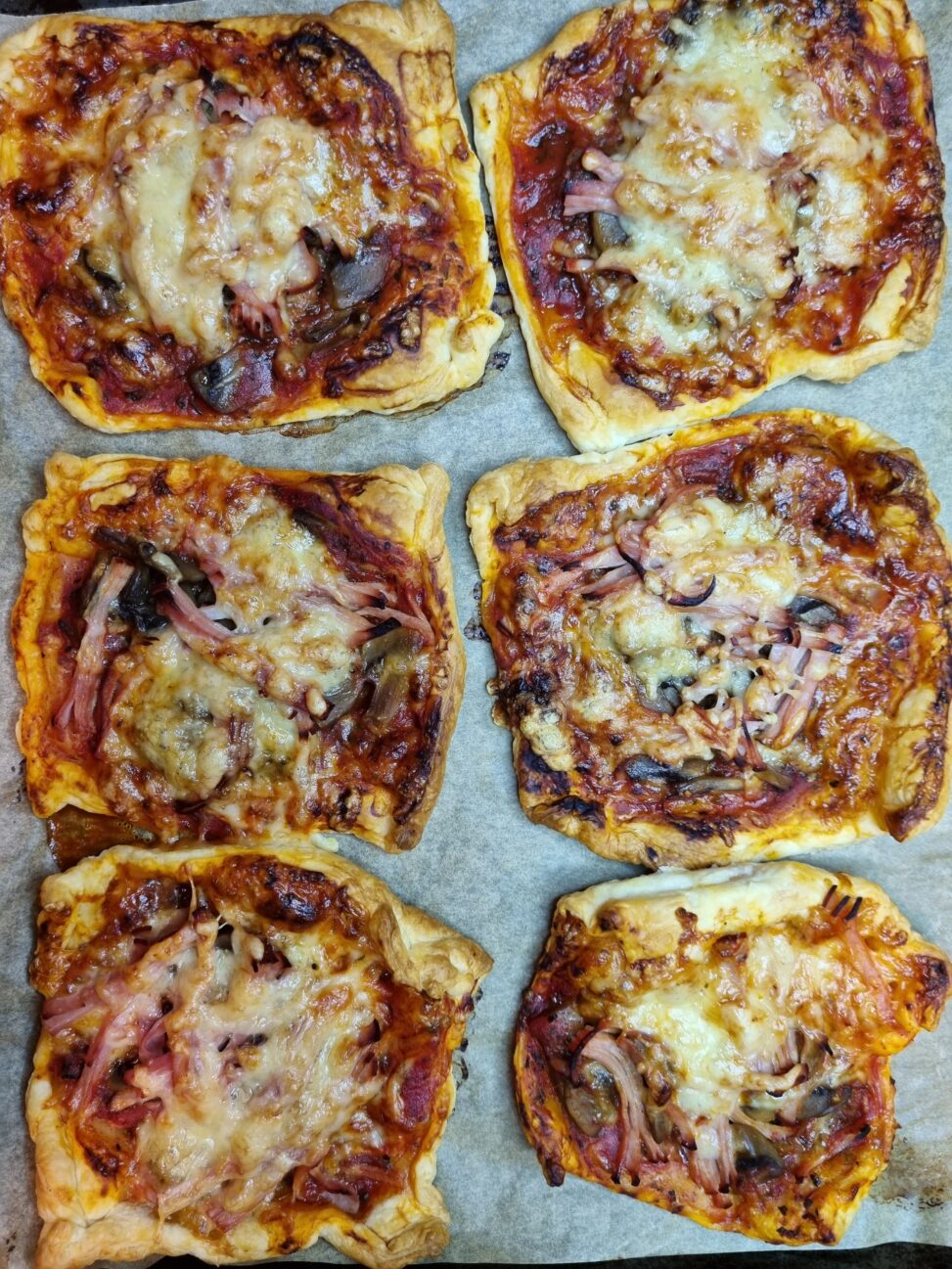 pieczarki podsmażamy z cebulą na oliwie z oliwek, przyprawiamy solą i pieprzem. Ciasto francuskie kroimy na 6 części wykładamy passatę z przyprawami,usmażone pieczarki, wędlinę i ser. Zawijamy lekko rogi. Można posmarować mlekiem lub jajkiem. Pieczemy w 200 stopniach przez około 15-20 minut. Najlepiej podać z sosem czosnkowym.