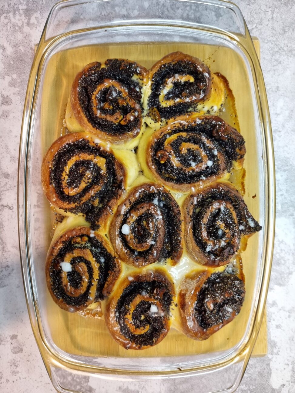 Robimy nadzienie: roztapiamy masło. Mak łączymy z miodem, rodzynkami i orzechami. Smarujemy rozwałkowane ciasto masłem, a następnie kładziemy nadzienie makowe. Zawijamy i kroimy na mniejsze kawałki o grubości około 4cm. Odstawiamy do wyrośnięcia na 30min. Opcjonalnie posmaruj je po wierzchu odrobiną mleka lub jajkiem. Pieczemy w 180stopniach przez około 20minut. Składniki na lukier wymieszaj ze sobą, posmaruj przestygnięte bułeczki.