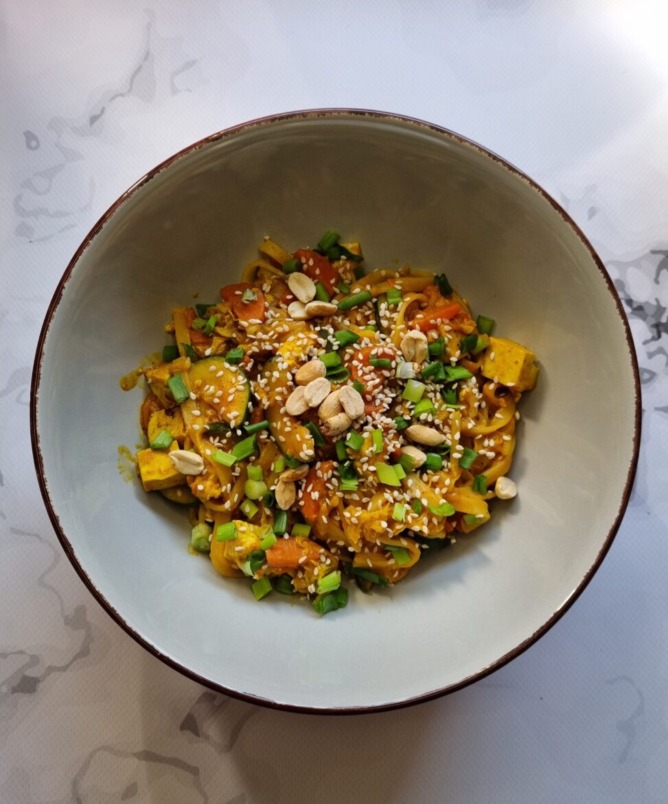 makaron ugotuj według instrukcji na opakowaniu. Warzywa i tofu pokrój, przypraw i podsmaż na oliwie do miękkości. Składniki sosu wymieszaj dokładnie. Do warzyw dodaj makaron i sos-całość dokładnie wymieszaj. Posyp szczypiorem, sezamem i orzeszkami ziemnymi.