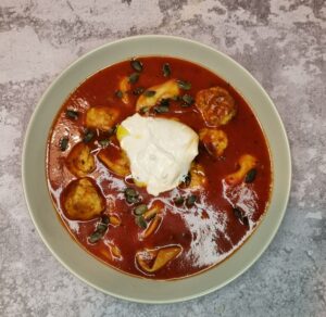 Passatę i wodę wlewamy do garnka, następnie dodajemy przyprawy: pieprz, sól, bazylię, oregano, ziele angielskie, liście laurowe, cebulę i czosnek- całość gotujemy. W międzyczasie robimy pulpeciki, czyli mięso mielone mieszamy z przyprawami: pieprz, sól, przyprawa do indyka, czosnek, zioła prowansalskie- dokładnie mieszamy i formujemy pulpeciki. Następnie podsmażamy je na oliwie z oliwek. Do zupy dodajemy usmażone pulpeciki i tortelloni, ewentualnie jeszcze doprawiamy, wyjmujemy cebulę, czosnek, liście laurowe i ziele angielskie. I całość gotujemy jeszcze około 5/10 minut.