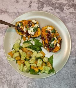 Bataty kroimy na pół, polewamy oliwą z oliwek, dajemy sól i pieprz i do piekarnika nagrzanego na 200stopnii na około 40minut. Przygotowujemy farsz, czyli kroimy fetę, pomidory suszone, szarpiemy rukolę- całość razem mieszamy i przyprawiamy pieprzem. Następnie wyjmujemy część ze środka batata, kładziemy farsz, później tą część z batata i znowu farsz.