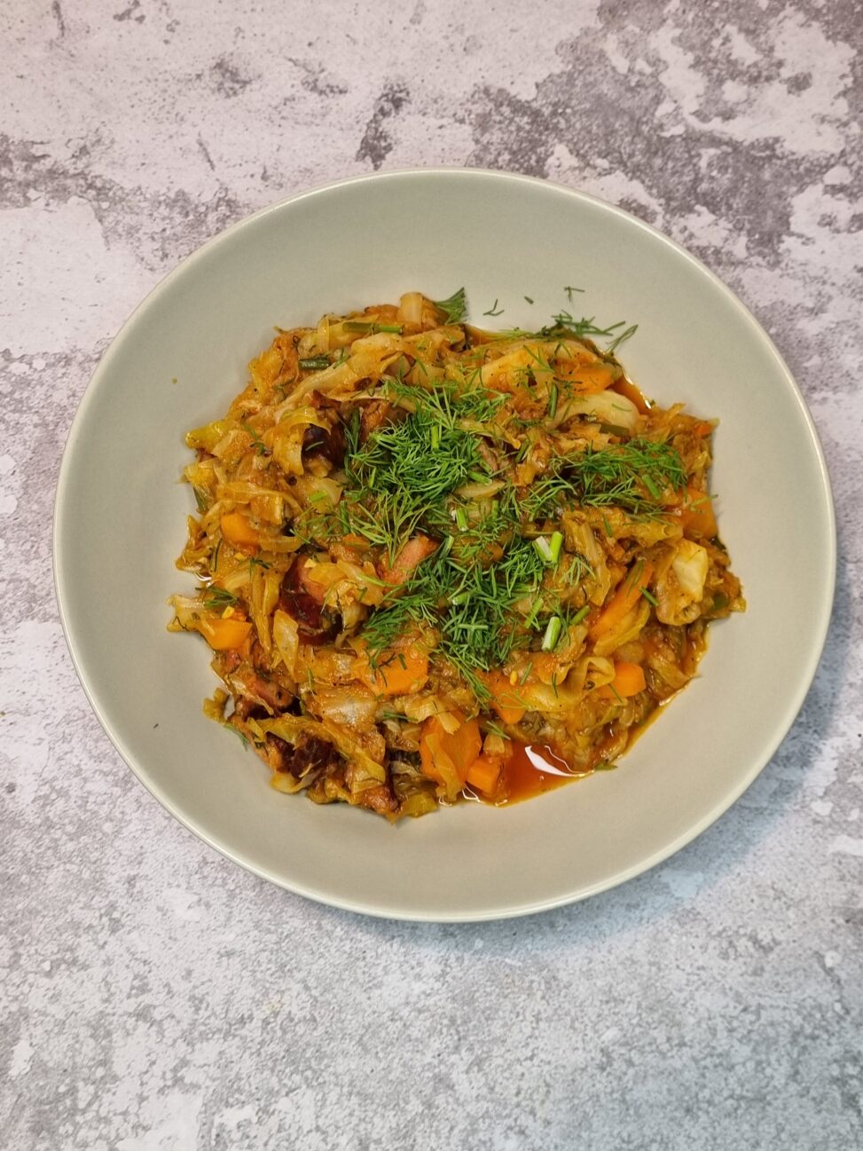 kapustę kroimy, zalewamy 2 szklankami wody i gotujemy do miękkości (pierwszą wodę odlewam), znów zalewam wodą, tym razem jedną dużą szklanką, dodaje przyprawy, bulion, koncentrat, keczup i dokładnie mieszam. Kiełbasę podsmażyłam na patelni, dodaję do kapusty i wszystko jeszcze raz dokładnie mieszam- gotuje jeszcze całość razem przez około 10minut.