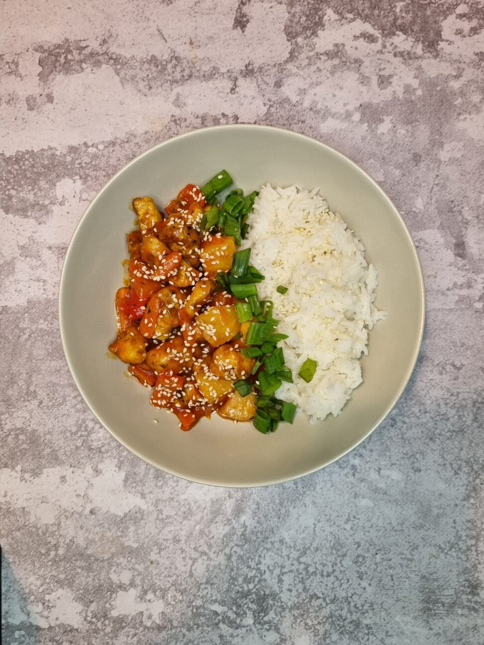 ryż ugotuj według instrukcji na opakowaniu. Na patelni rozgrzej olej, następnie dodaj pokrojoną w cienkie słupki marchewkę i paprykę pokrojoną w średniej wielkości kostkę. Wszystko razem podduś do miękkości. Kurczaka pokrój w kostkę, przełóż do miski, przypraw solą, pieprzem i przyprawami, dodaj mąkę ziemniaczaną – całość dokładnie wymieszaj (dodatek mąki ziemniaczanej sprawi, że kurczak w tym daniu będzie delikatny). Tak przygotowanego kurczaka dodaj na patelnię i podsmażaj, aż mięso się zetnie. W międzyczasie przygotuj sos, wszystkie składniki ze sobą połącz i dokładnie wymieszaj. Na patelnię dodaj kawałki ananasa oraz wcześniej przygotowany sos. Wymieszaj dokładnie i przypraw do smaku. Opcjonalnie dolej odrobinę wody, aby polepszyć konsystencję całej potrawy. Podaj z ugotowanym ryżem. Posyp sezamem i szczypiorem.